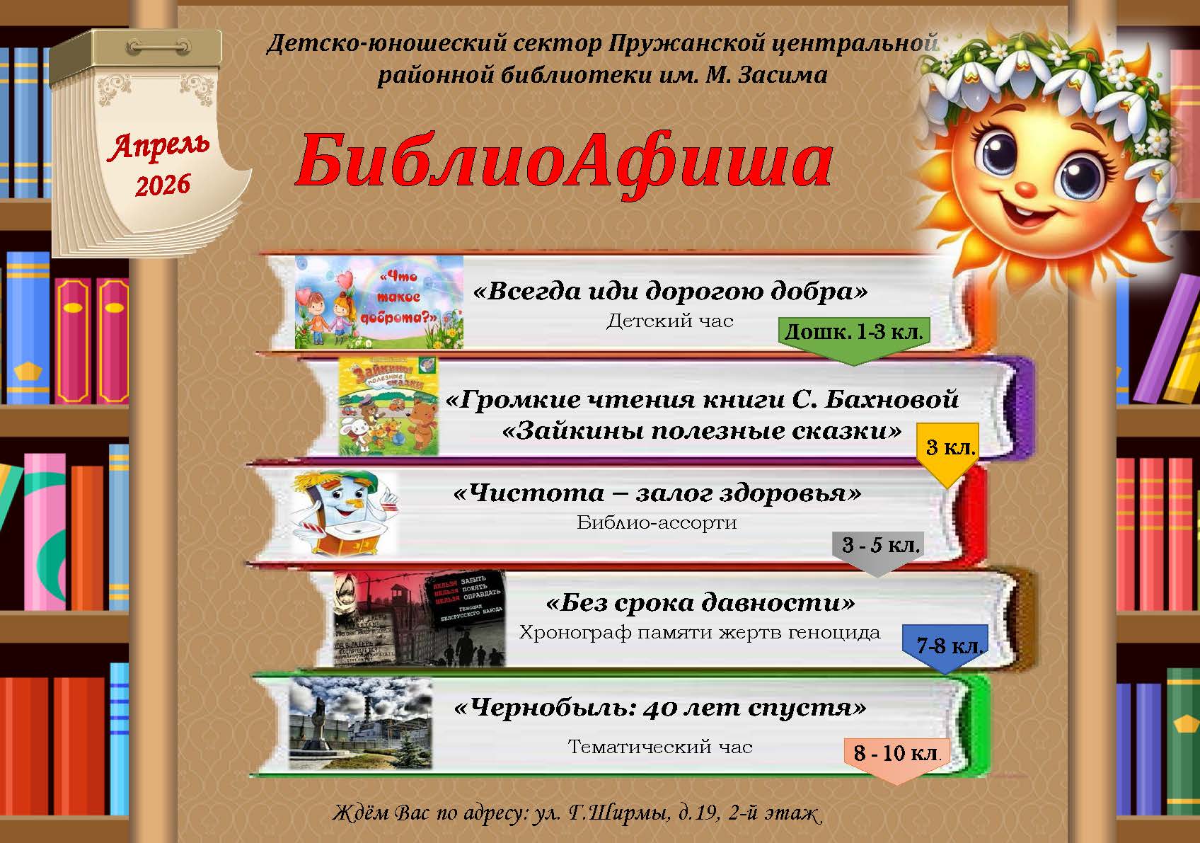 Детско-юношеский сектор ЦРБ им. М. Засима приглашает посетить мероприятия в апреле 2026 года. Поделиться новостью: Навигация по записям Запрашаем наведаць у красавіку