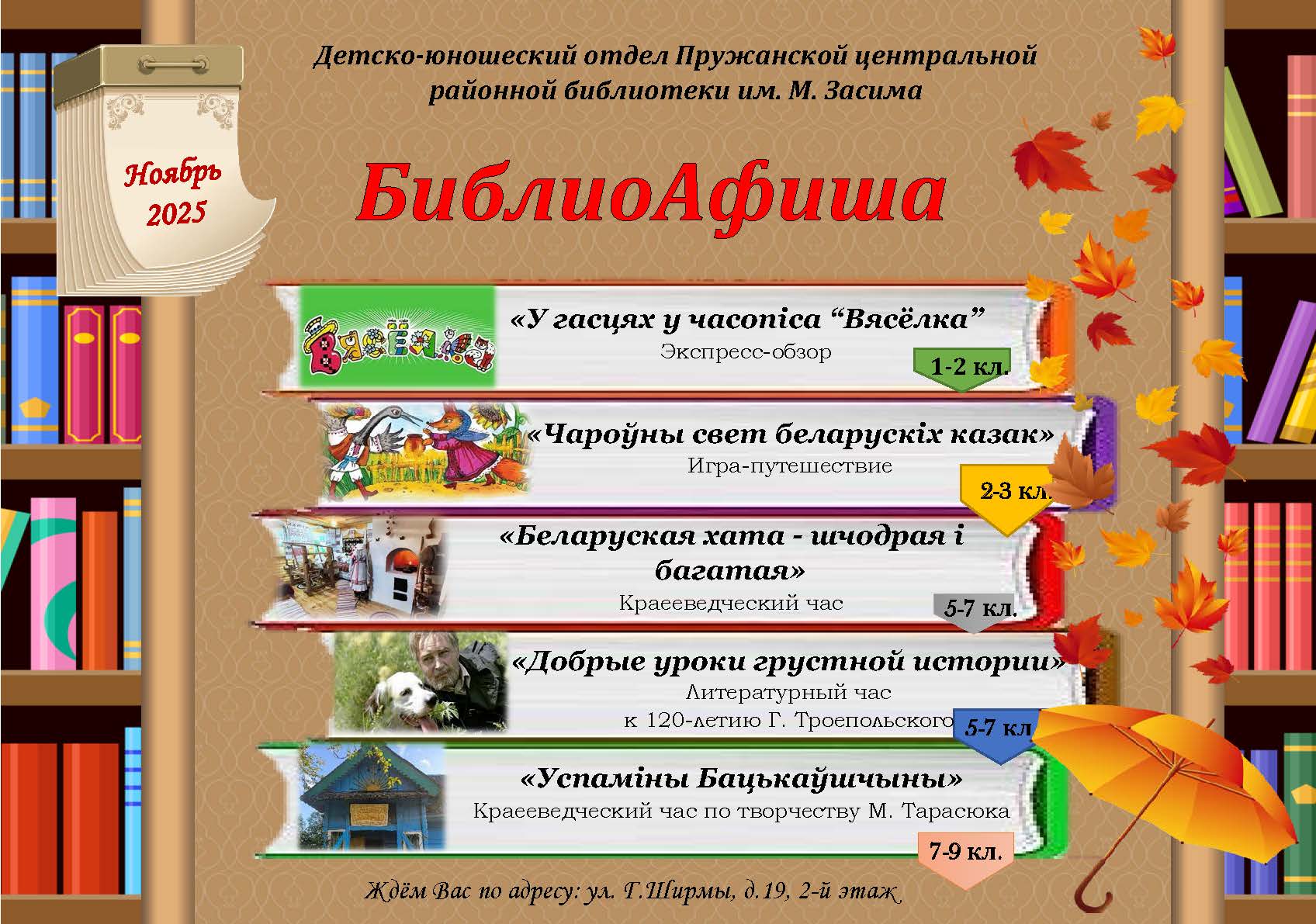 Детско-юношеский отдел ЦРБ им. М. Засима приглашает посетить мероприятия в ноябре Поделиться новостью: Навигация по записям Запрашаем наведаць у лістападзе