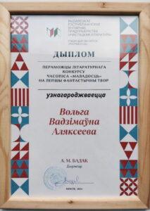 На ХХХІІІ Мінскай міжнароднай кніжнай выставе-ярмарцы намеснік дырэктара ДУК “Пружанская цэнтралізаваная бібліятэчная сістэма” Аляксеева Вольга Вадзімаўна ўзнагароджана дыпломам пераможцы літаратурнага конкурсу часопіса “Маладосць” на лепшы фантастычны твор.