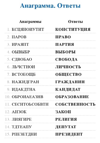 Вед.2. Второй гейм нашей игры будет посвящён важным словам, которые вы встретите в Основном законе нашей страны. Только буквы в этих словах перепутались. Ваша задача составить загаданное слово. Смотрите на экран и называйте слова. Напоминаем, что отвечает та команда, которая первой поднимет сигнальную карточку. Одно слово – 1 балл (команды отвечают и зарабатывают баллы).